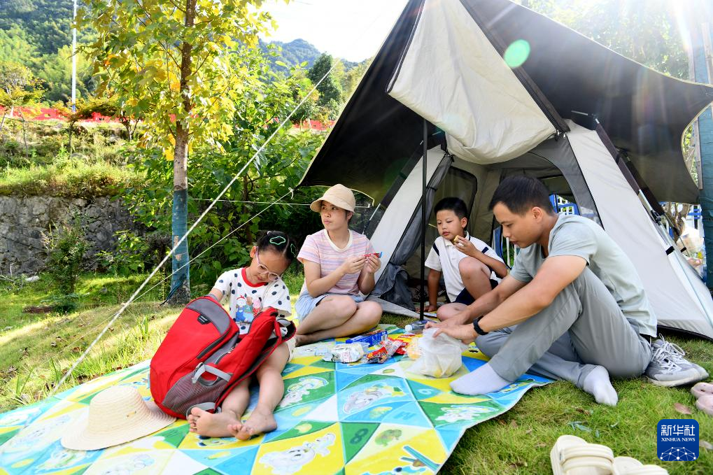 8月29日,在湖北省咸宁市通城县黄龙林场,游客享受露营的乐趣。