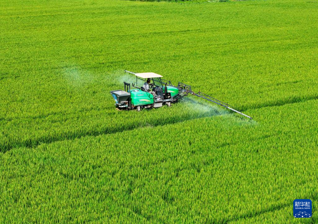 9月10日,江苏省泰兴市济川街道众贤村农民驾驶植保机开展水稻病虫害防治作业(无人机照片)。
