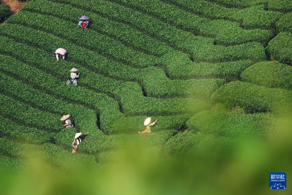 10月11日,茶农在广西昭平县大脑山生态茶园采摘晚秋茶。