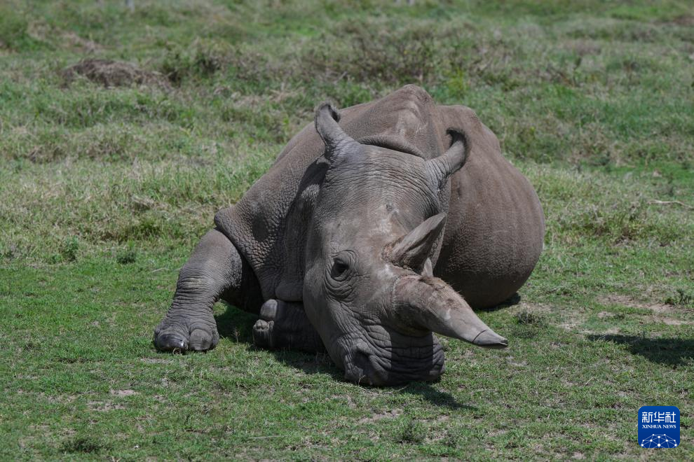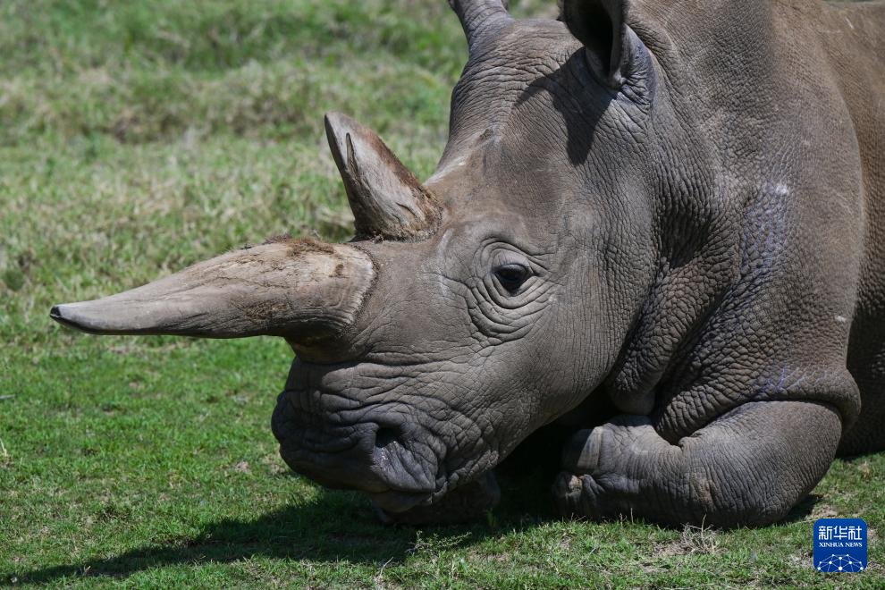 这是10月7日在肯尼亚中部莱基皮亚郡奥尔佩杰塔自然保护区拍摄的雌性北方白犀牛“法图”。
