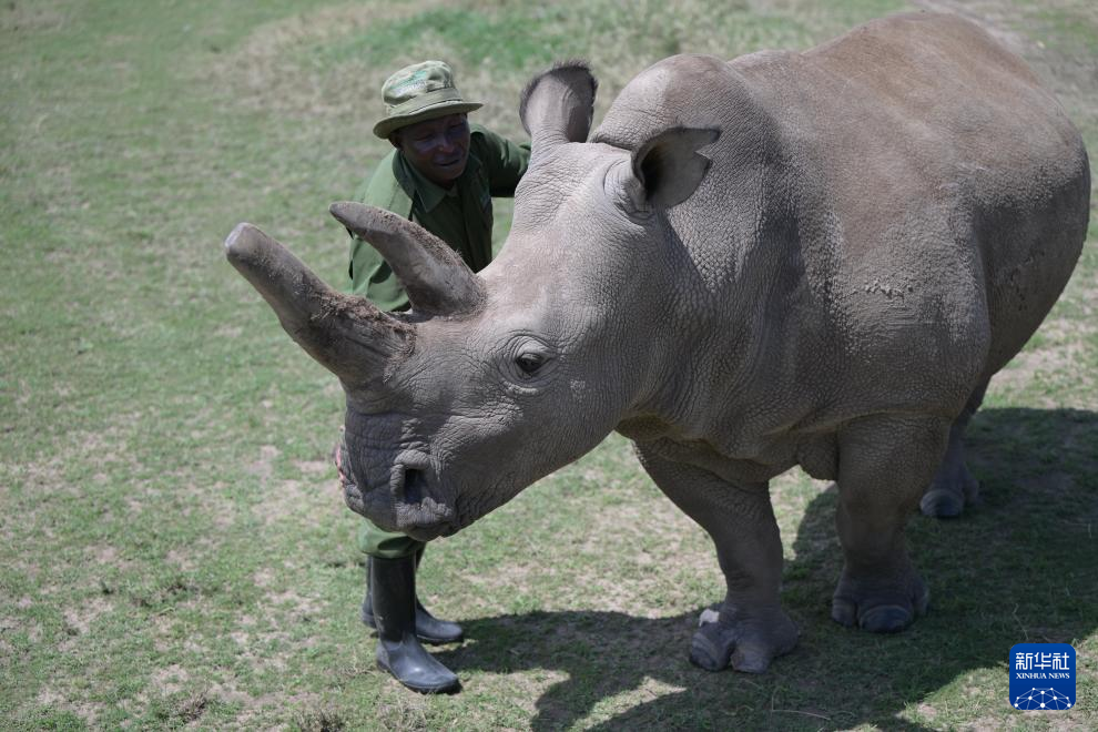 10月7日,在肯尼亚中部莱基皮亚郡奥尔佩杰塔自然保护区,工作人员与雌性北方白犀牛“娜金”互动。