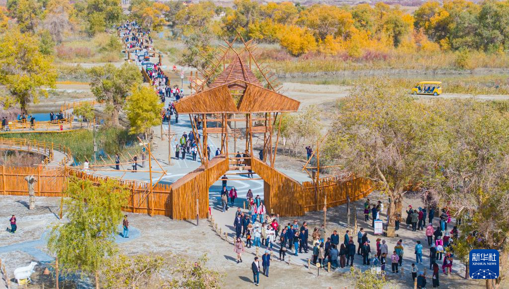 10月18日,新疆巴音郭楞蒙古自治州尉犁县罗布人村寨景区游人如织(无人机照片)。