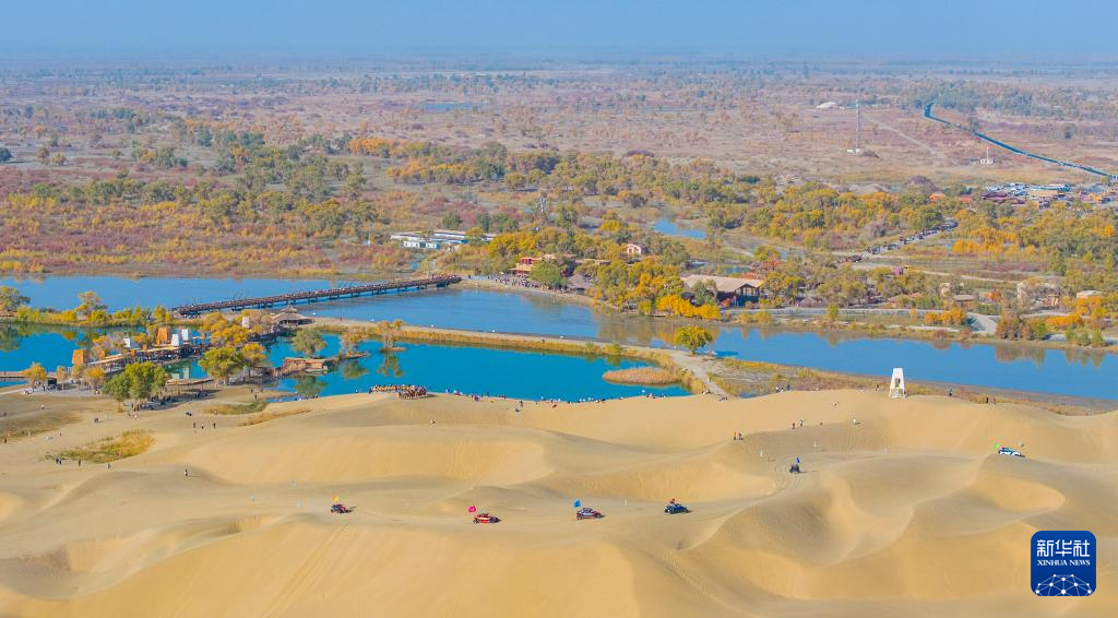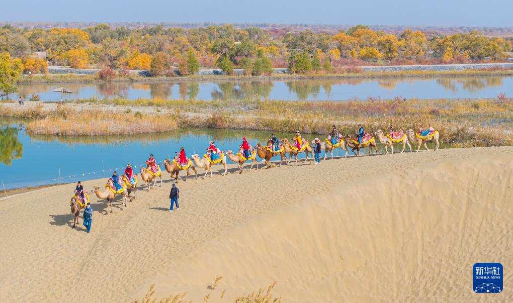 金秋时节,新疆巴音郭楞蒙古自治州尉犁县境内的沙漠胡杨景观与塔里木河互相映衬,美不胜收,吸引不少游客观光游览。