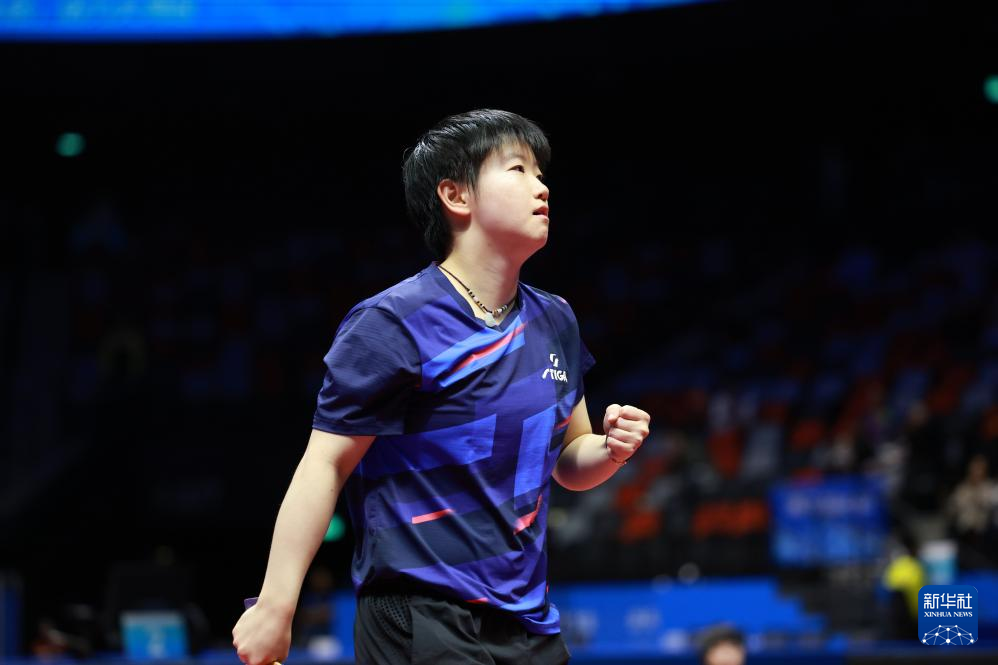 11月16日,河北队选手孙颖莎在比赛中庆祝得分。