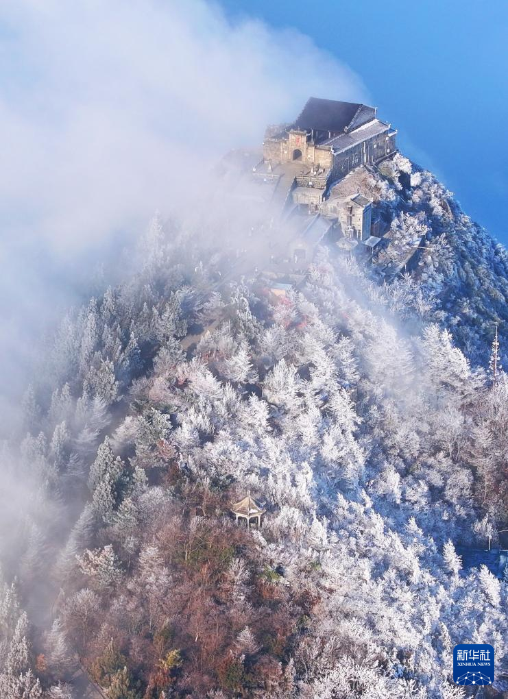 1月6日在南岳衡山风景区拍摄的雾凇云海景观(无人机照片)。