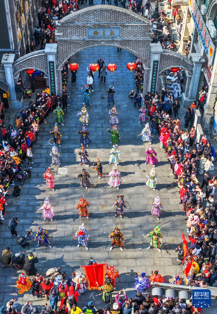 2月19日,来自广东省潮汕地区的英歌队在江苏省连云港市海州区民主路老街表演潮汕英歌舞(无人机照片)。
