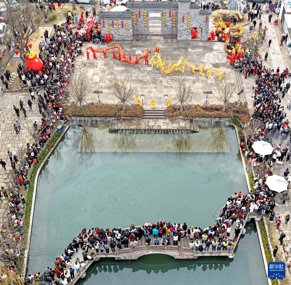 2月19日,民间艺人在浙江省台州市仙居县白塔镇高迁村表演舞龙(无人机照片)。