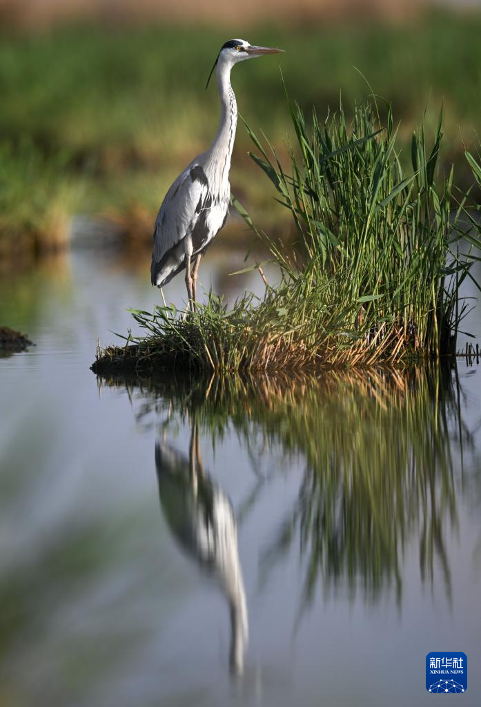 4月18日,苍鹭在沙湖中栖息、觅食。