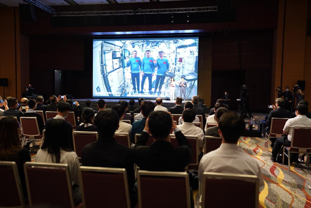 香港青年学子向“太空出差三人组”——神舟十二号航天员聂海胜、刘伯明和汤洪波3名航天员进行现场连线提问。新华社记者吕小炜摄