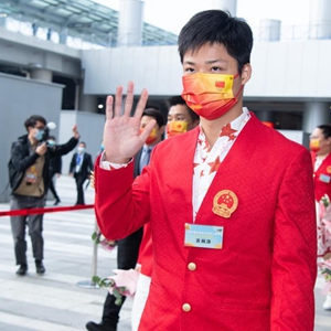 12月19日,内地奥运健儿代表团成员苏炳添(前)在欢迎仪式上。新华社记者 张金加 摄