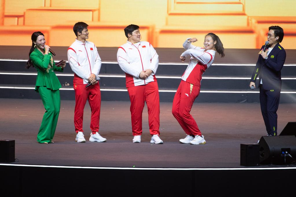 12月20日,内地奥运健儿代表团成员苏炳添(左二)、巩立姣(左三)、刘诗颖(右二)在活动中。新华社记者 张金加 摄