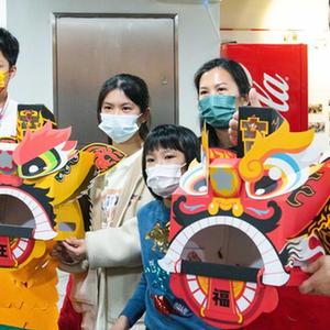 在工联氹仔湖畔综合服务中心,参观完跳舞室、卡拉ok室后,奥运健儿们分桌与小朋友及家长共同制作“醒狮”道具。