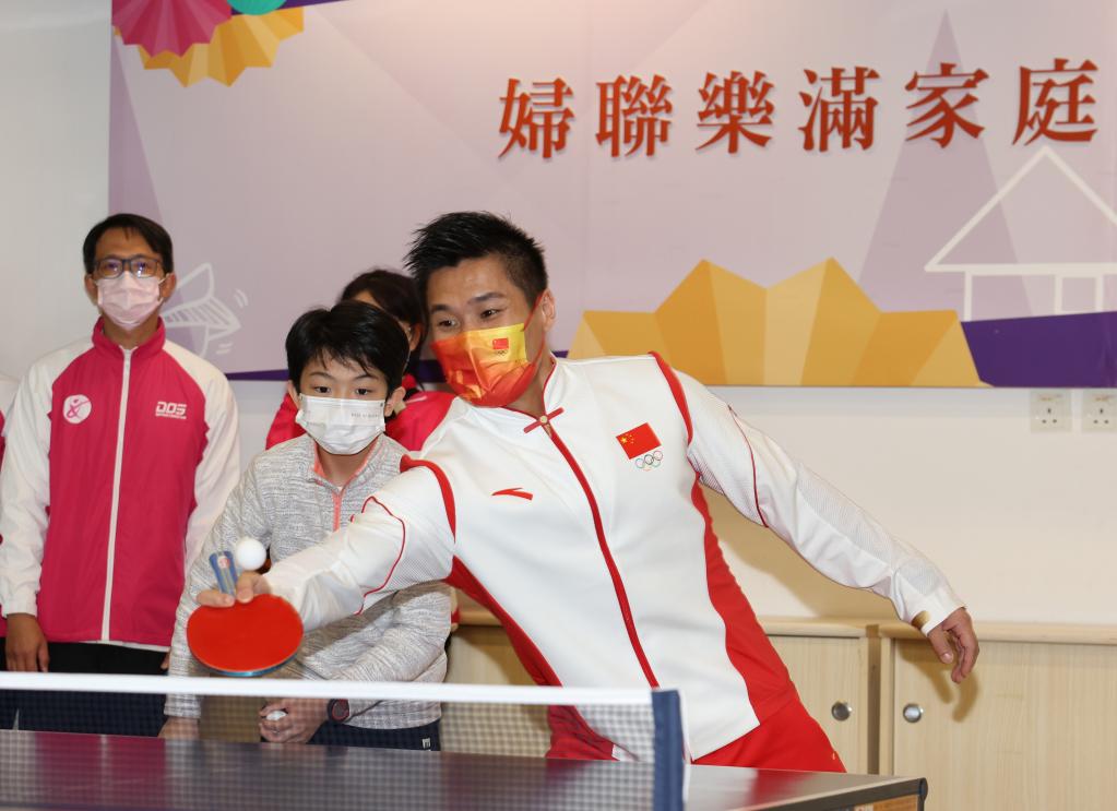 12月21日,在澳门妇联乐满家庭服务中心,内地奥运健儿代表团成员吕小军(右)与社区居民一起打乒乓球。新华社记者 贾浩成 摄