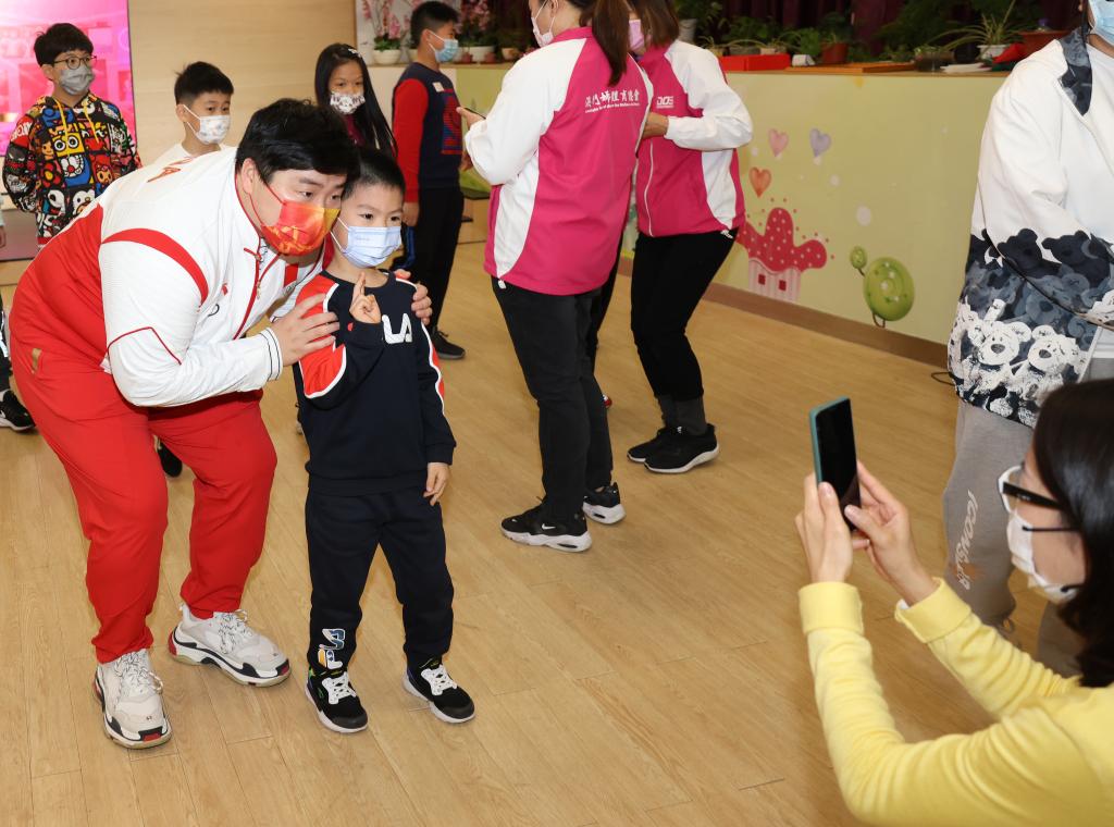 12月21日,在澳门妇联乐满家庭服务中心,内地奥运健儿代表团成员巩立姣(左一)与社区小朋友合影。新华社记者 贾浩成 摄