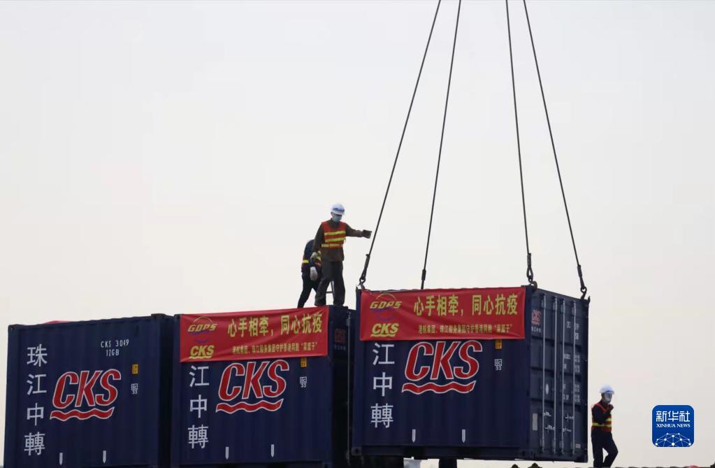 2月18日,工人把供港蔬菜的货箱装载到轮船上。新华社发