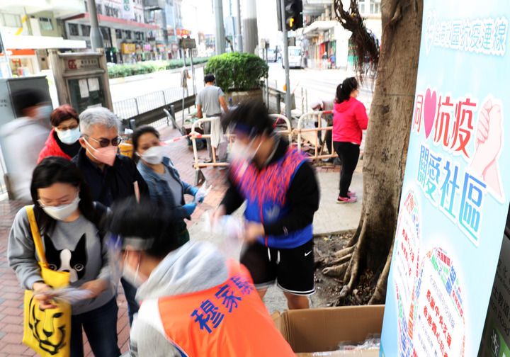 3月1日,在香港湾仔区一处街站,义工免费派送中央援港抗疫物资。新华社记者李钢 摄