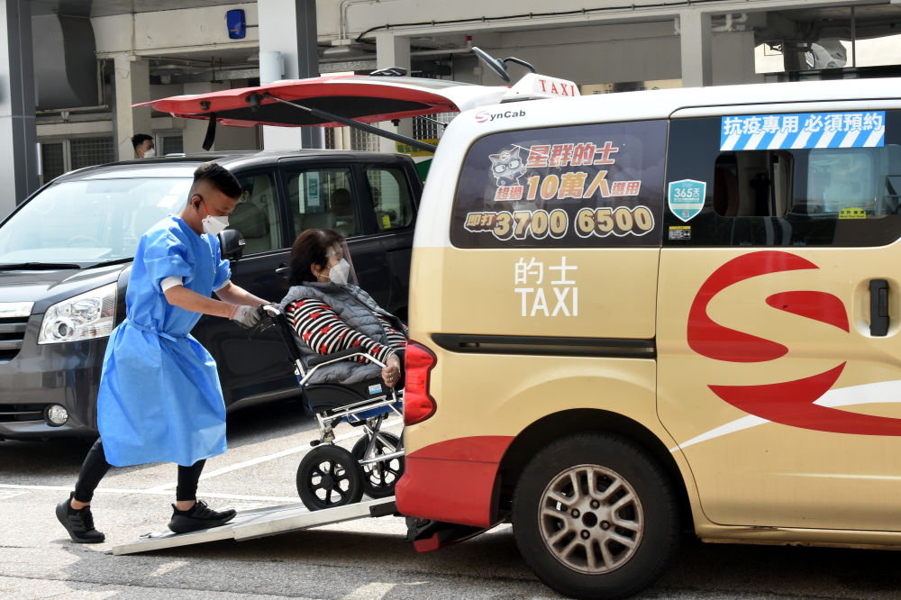 3月18日,在香港南葵涌,抗疫专用的士接载市民候诊。新华社记者卢炳辉 摄