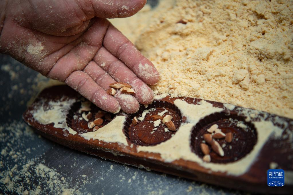 4月14日,“最香饼家”师傅在模具中撒入杏仁碎粒。新华社记者 张金加 摄