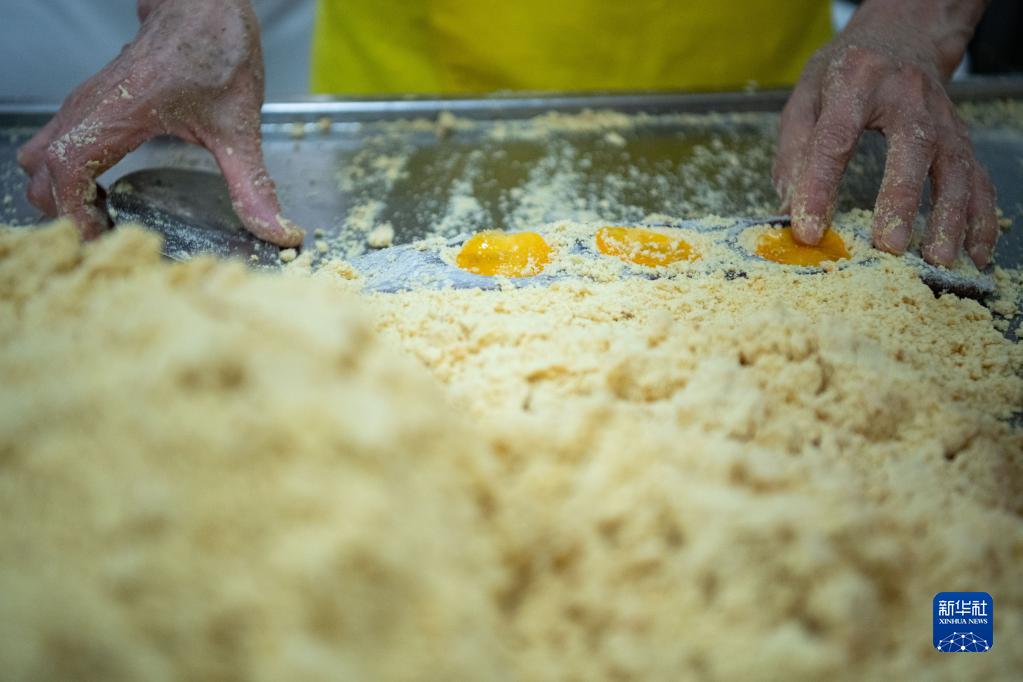 4月14日,“最香饼家”师傅在做传统的蛋黄肉心杏仁饼。新华社记者 张金加 摄