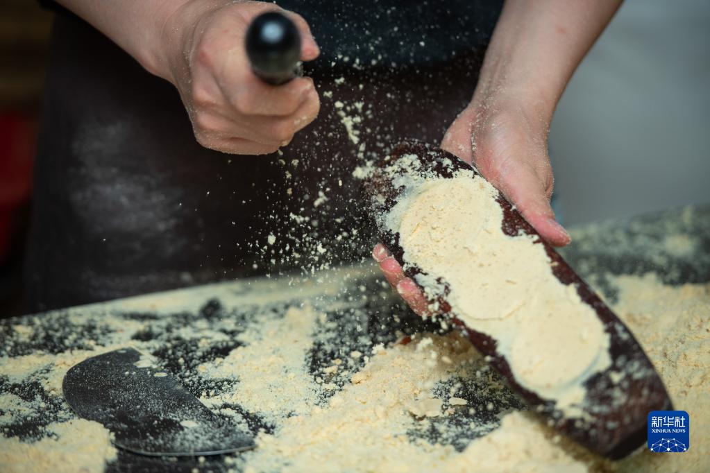 4月14日,“最香饼家”师傅在做杏仁饼。新华社记者 张金加 摄
