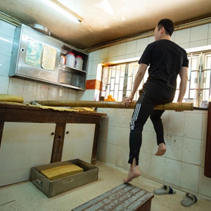一晃一颠,李文龙坐在三丈长的大竹竿一段,现场演绎制面。在一上一下游刃有余的弹跳中,竹竿不断碾压面团,面粉粒子相互黏合紧扣。看似轻松实则是一项体力活,李文龙要和面团这样“跷跷板”近一个钟头,经过万次的反复碾压,方能印出通透薄软的面皮。