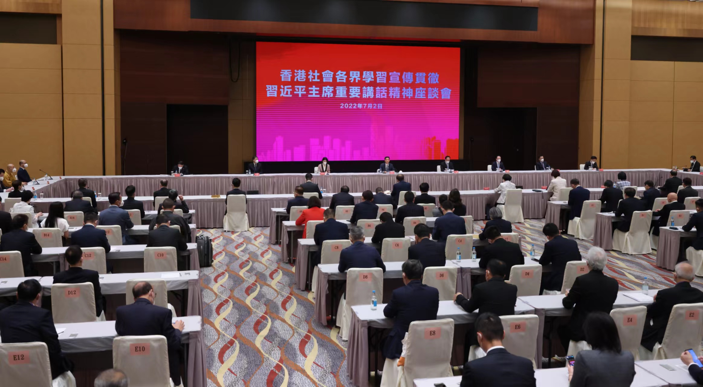 7月2日上午,中央政府驻港联络办举办香港社会各界学习宣传贯彻习近平主席重要讲话精神座谈会。中央政府驻港联络办主任骆惠宁出席并作导读发言,港区全国人大代表、全国政协委员、香港主要政团社团代表、驻港中资企业负责人、社会各界代表人士,以及中联办有关负责人等共200余人参加。中联办副主任陈冬主持座谈会。