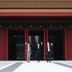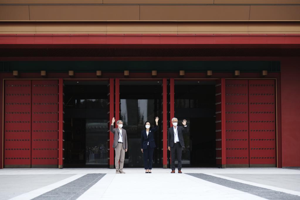 2022年5月10日,在香港故宫文化博物馆,西九文化区管理局行政总裁冯程淑仪(中)、香港故宫文化博物馆馆长吴志华(右)和香港故宫文化博物馆设计师严迅奇(左)在挥手致意。新华社记者 王申 摄