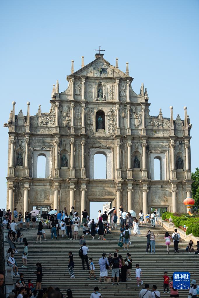 10月4日,游客在澳门大三巴牌坊前游览。新华社记者 张金加 摄