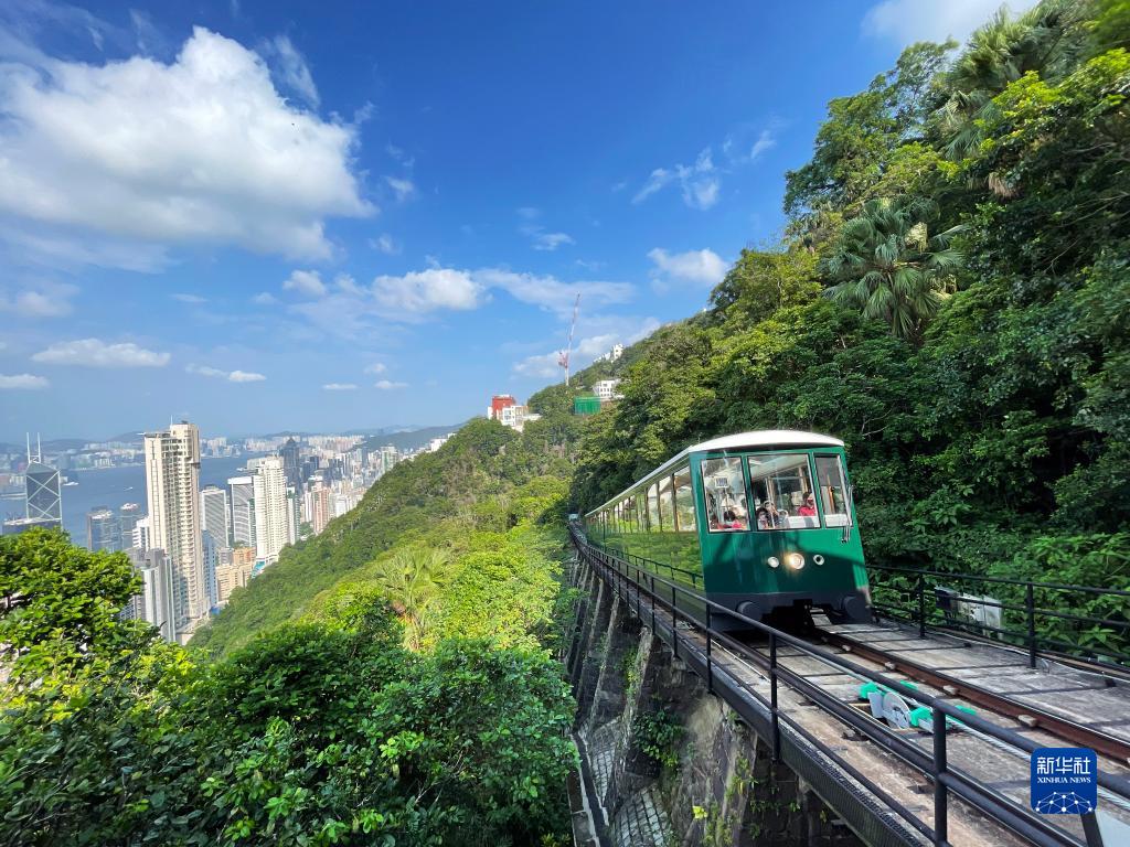香港山顶缆车在来往中环总站和太平山顶的路上缓缓前进。沿路满山青葱,不时能从婆娑树影之间看到远方的海岸线和群山,以及鳞次栉比的高楼大厦。阳光透过车窗洒落在车厢内,乘客纷纷拿出手机,拍下眼前的景色。
