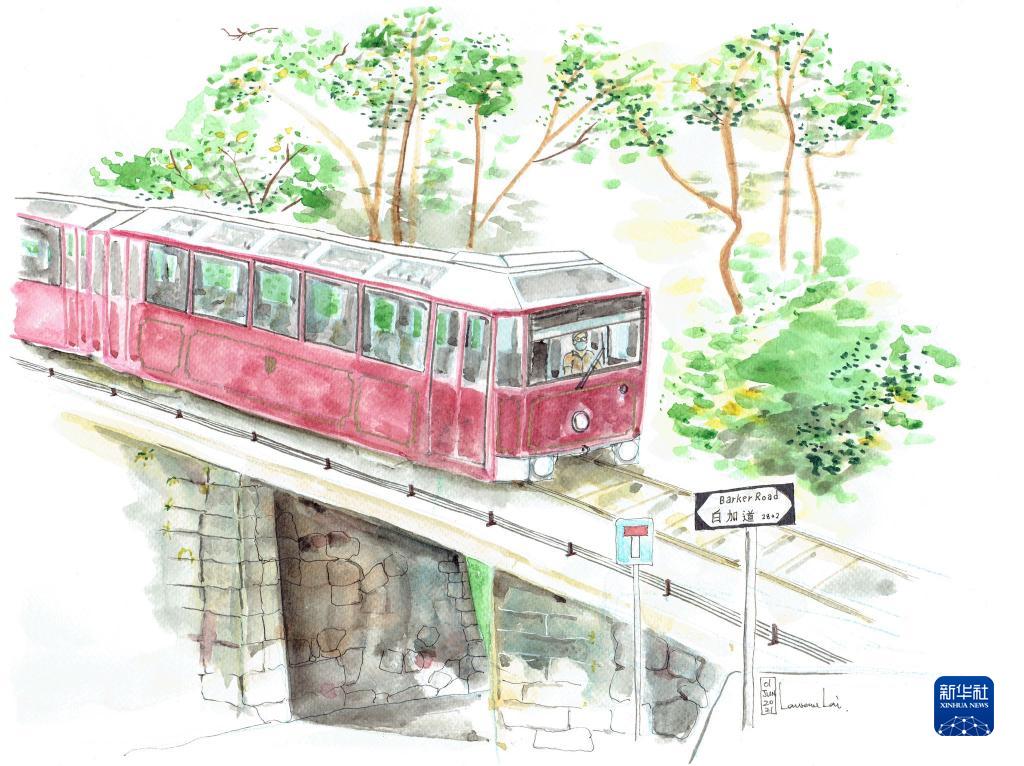黎兆明画笔下的香港第五代山顶缆车的酒红色车厢身影(图片由受访者提供)。新华社发