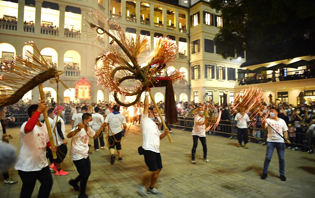 11月20日晚,在香港中环的历史建筑大馆,一场非遗表演吸引了众多市民观看,这便是香港传统民俗活动——大坑舞火龙。