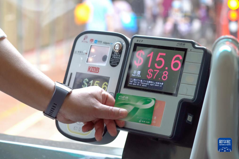 九巴工作人员示范使用长者八达通乘车(5月12日摄)。新华社记者 龙镜伊 摄