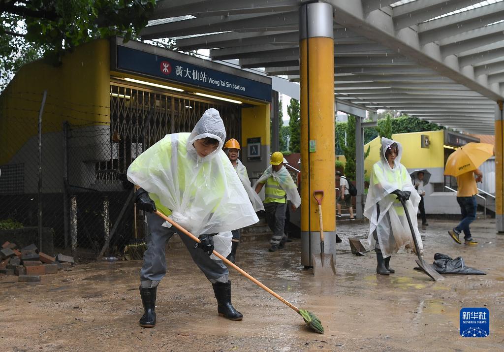 9月8日,工作人员在香港黄大仙地铁站外清理淤泥。新华社记者 陈铎 摄