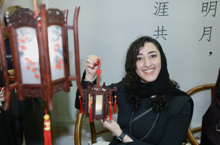 外国企业代表Ms. Morvarid Najafi展示自己亲手制作的红木宫灯。她体验了非遗手作工作坊,在传统工艺师的指导下学习制作红木宫灯。她表示,这一次活动让她有机会深入了解中国文化传统。