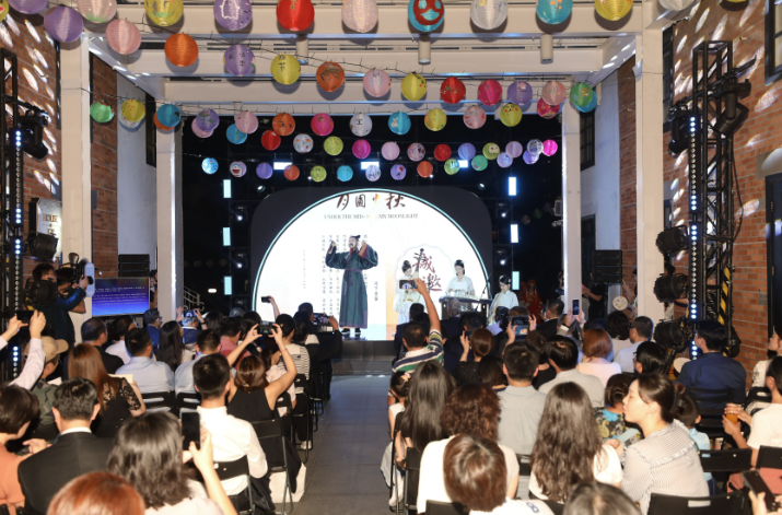 活动演出环节的第一幕以“共赏明月”为主题,表演者以琵琶独奏广东民歌《彩云追月》,现场更有演员趣味演绎李白穿越时光,与自己的老乡兼偶像司马相如会面的短剧。《彩云追月》一曲风格轻快独特,描写人们心目中的月宫仙境,烘托了市民平凡生活的轻松写意,该曲自清代诞生以来流传多年,除了被多种中外乐器演奏外,亦被多人填词翻唱。