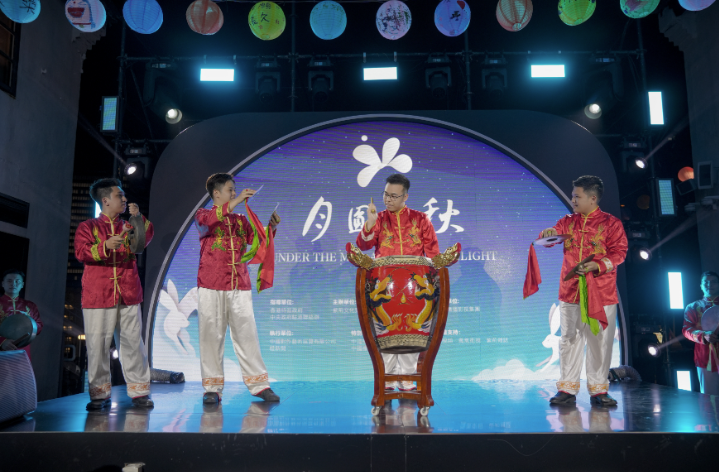 由紫荆文化集团主办的“月圆中秋——驻港领事赏民俗”活动,集汉服秀、民乐表演、非遗制作、美食体验于一体,在古筝、琵琶、箫合奏的悠扬乐曲声中,“衣起锦官城”汉服秀登场,专程从成都坐高铁赶赴香港的“花蕊夫人”、“司马相如”和“范蠡”等走进观众席,与外国友人互动交流。锣鼓喧天,节奏欢快,潮州大锣鼓的表演引发现场欢呼。潮州大锣鼓于2006年第一批入选国家级非物质文化遗产名录,是广东潮汕地区以大鼓为中心、以唢呐为领奏的大型合奏形式。