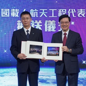 在离开香港前,香港特区政府在礼宾府为代表团举行了欢送仪式。香港特区行政长官李家超致辞时表示,通过这次访问,相信香港市民都能深深感受到中国人在实现航天梦的征程上,具有坚定的奋斗决心。香港市民也为国家在航天科技上取得的非凡成就,深感自豪。