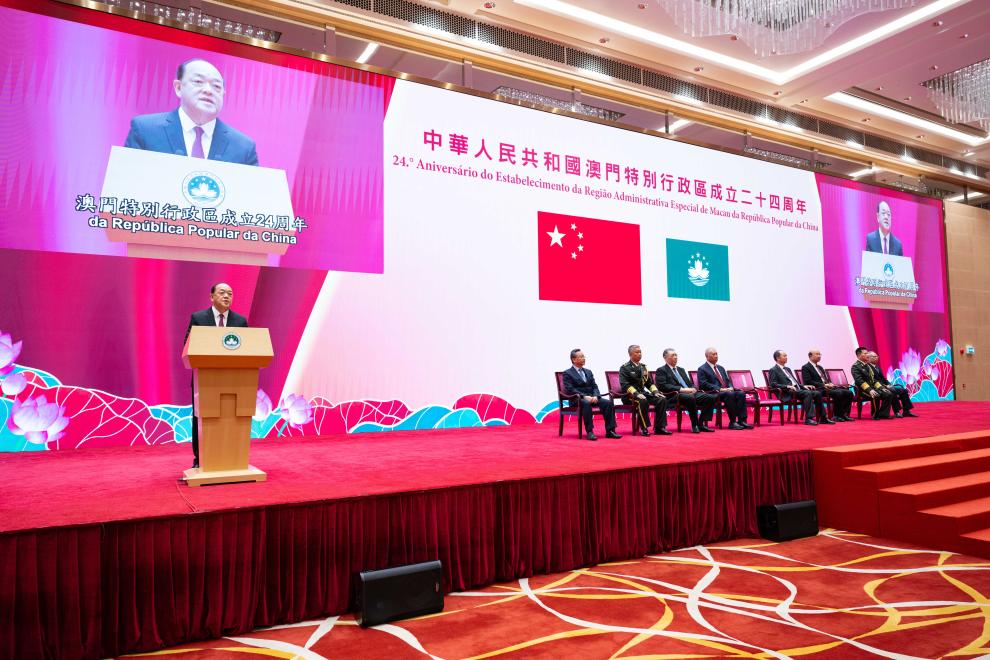 庆祝澳门特别行政区成立24周年招待酒会上午9时30分在中国与葡语国家商贸合作服务平台综合体举行。澳门特区行政长官贺一诚致辞表示,特区政府将团结带领社会各界,抓住国家发展带来的历史机遇,不断推进具有澳门特色的“一国两制”成功实践,努力以新的发展成果迎接中华人民共和国75周年华诞和澳门回归祖国25周年,为强国建设、民族复兴作出新的更大贡献。