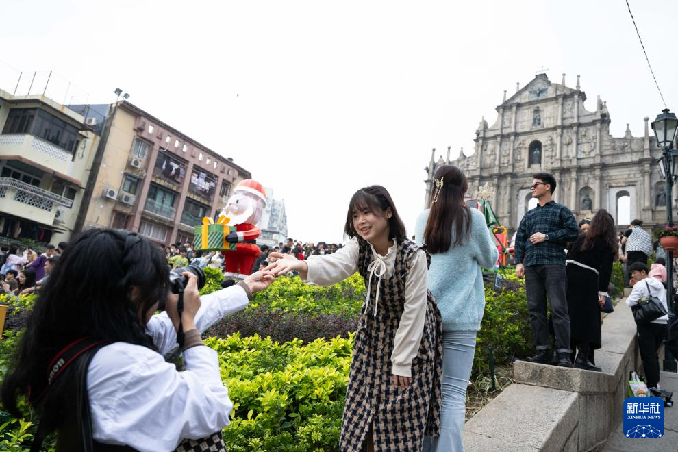 2023年12月31日,旅客在澳门大三巴牌坊前游览。新华社记者 张金加 摄