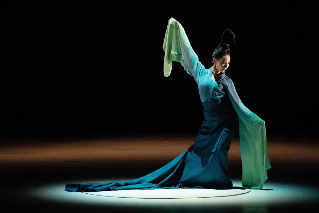 台上,舞者绛唇高髻、长袖翩跹,以绚烂之姿,勾勒出如诗如幻的无垠山河,将中国式古典美娓娓道来。