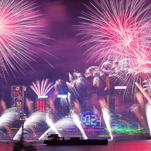 1月1日,绚烂的烟花绽放在维港上空。新华社记者 朱炜 摄