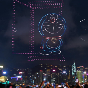 当晚7时30分左右,约1000架无人机闪烁着五彩缤纷的灯光从尖沙咀海滨上空的云层中钻出,伴随着现场动听的主题音乐,展示以“哆啦A梦”为主题的动态图案,包括“随意门”、竹蜻蜓、哆啦A梦、“100%朋友召唤铃”等,再现了哆啦A梦与好友们戴着竹蜻蜓翱翔的经典场景。