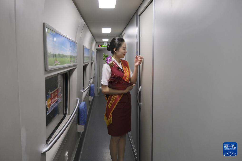 D910次列车乘务员准备向包厢内的旅客发放纪念品(6月15日摄)。新华社记者 王申 摄