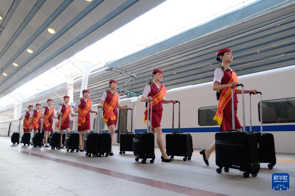 6月16日,D910次列车乘务员列队经过北京西站站台。新华社记者 王申 摄