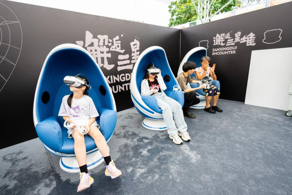 有时尚设计的加成,更有新潮科技的赋能。在四川德阳展区,三星堆文创区域内不仅有青铜大立人像、青铜纵目面具等复刻文物,还有几个蛋壳形VR互动舱。参观者可以通过虚拟现实技术“身临”不对外开放的三星堆考古现场,“亲手”操作一系列考古新技术。