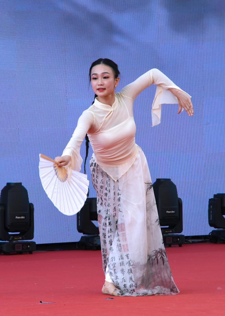 7月1日,香港青年艺术团演员吴章萌在“维园庆回归”活动中为观众表演国风舞蹈《纸扇书生》。新华社记者 陈铎 摄