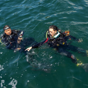 6月27日,李东桓(右)准备下潜搜寻“鬼网”。新华社记者 孟佳 摄