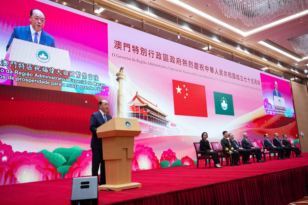 10月1日,澳门特别行政区政府举行酒会,庆祝中华人民共和国成立75周年。这是澳门特区行政长官贺一诚在致辞。新华社记者 张金加 摄