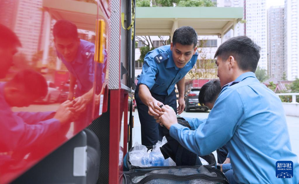 巴基斯坦裔消防员穆伟健(左)与同事一起对消防车进行例行检查(2024年10月28日)。新华社记者 陈铎 摄
