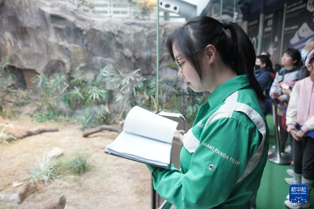 香港海洋公园动物部护理专员刘思颖在赛马会四川奇珍馆内记录大熊猫的状况(2025年1月16日摄)。新华社记者 褚萌萌 摄